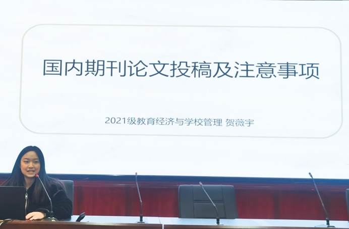 為營造研究生學術新氛圍,活躍學術思想,創(chuàng)設學術交流、經驗分享的平臺,學院于5月7日16:00在師范樓103學術報告廳開展“研精覃思 篤學不倦”學術沙龍活動,主題為國內外期刊投稿經驗分享。2021級教育學專業(yè)教育經濟與學校管理研究方向的賀薇宇、心理健康教育研究方向的狄思雨做了分享,學院研分會學術部楊玉霞主持活動,本次沙龍有幸邀請到學院教育技術系主任張紅艷教授、心理學系教師孫小蒙副教授為點評嘉賓,全院在校研究生參加。
