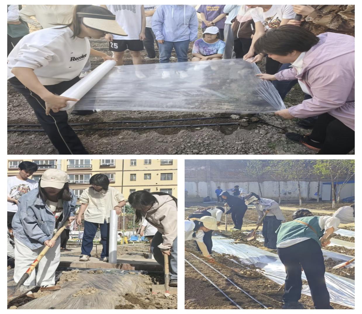 接下來,同學(xué)們來到幸福石榴園勞動(dòng)實(shí)踐基地。七個(gè)小組各自領(lǐng)取了相應(yīng)的勞動(dòng)任務(wù),隨后按照分工安排前往地里開展勞動(dòng)。鋪膜小組由兩個(gè)男孩子負(fù)責(zé)拉薄膜,女孩子則用鐵锨在薄膜邊緣進(jìn)行蓋土操作。在小組成員的默契協(xié)調(diào)配合下,一塊塊土地被薄膜完整且嚴(yán)實(shí)的覆蓋。而種植草莓的小組也在辛勤勞作且相互配合,一部分小組成員在原來的草莓圃中挖掘草莓植株,另一部分則在新的種植園里進(jìn)行移栽。沒多久,草莓植株便被迅速且及時(shí)地移栽到了新的苗圃里。