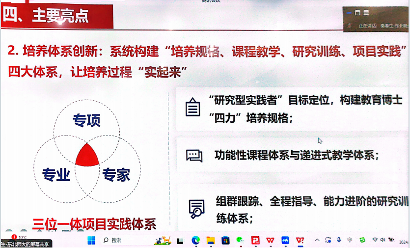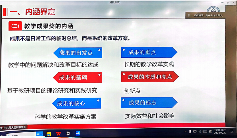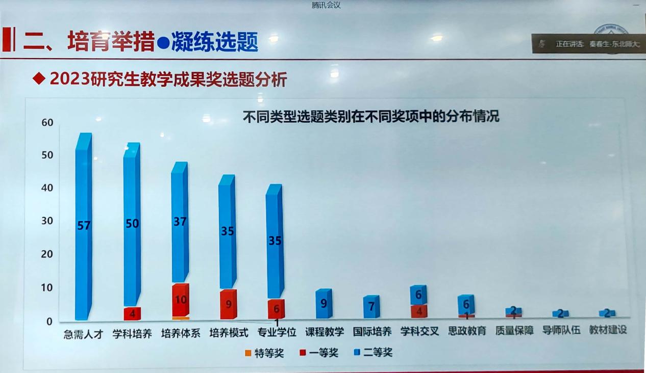 秦春生研究員結(jié)合東北師范大學(xué)近年國家級教學(xué)成果獎成功申報的典型案例,從內(nèi)涵界定、培育舉措、申報要點、案例分析四個方面進(jìn)行介紹。秦院長重點對選題的凝練、申報書的撰寫、主要解決的教學(xué)問題進(jìn)行了詳細(xì)講解,認(rèn)為選題要把握立德樹人和提升質(zhì)量這兩個研究生教育的重要趨勢,還要緊密聯(lián)系國家的教育方針政策。其次,秦院長結(jié)合2023年研究生教學(xué)成果獎獲獎情況,啟發(fā)導(dǎo)師們重點關(guān)注國家急需人才的培養(yǎng)以及學(xué)科專業(yè)建設(shè),也就是加強對宏觀和中觀層面的研究,并建議導(dǎo)師們根據(jù)評審標(biāo)準(zhǔn)中的分值占比,有側(cè)重地填寫申報書。最后,在成果主要解決的教學(xué)問題上,秦院長指出我院應(yīng)從基礎(chǔ)教育中急需解決的問題入手。