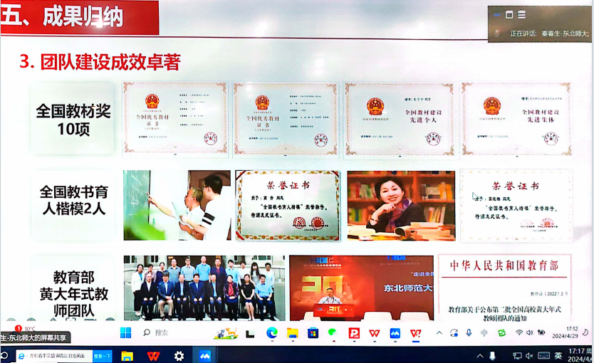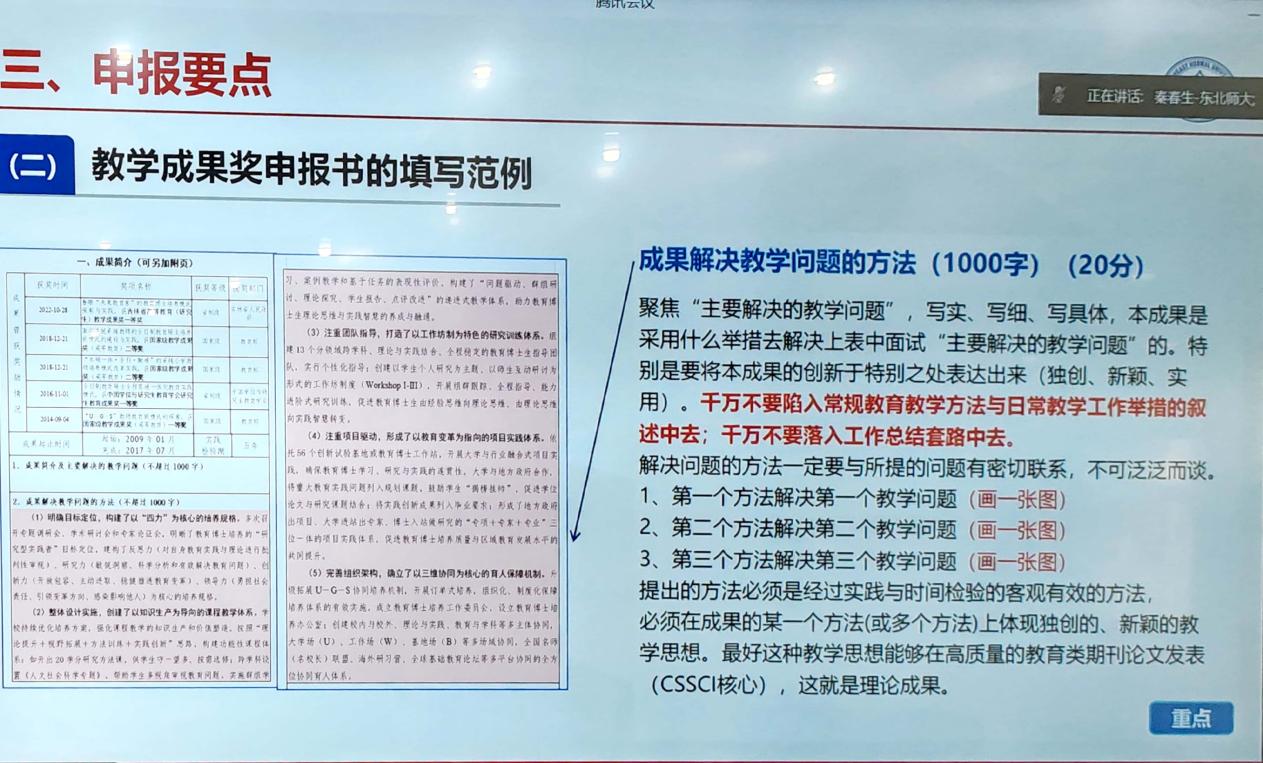 結(jié)合具體范例,糾正問題不足。一方面,秦院長結(jié)合東北師范大學(xué)教學(xué)成果一等獎的案例從填寫規(guī)則、成果解決的教學(xué)問題、解決教學(xué)問題的方法到成果的創(chuàng)新點和推廣應(yīng)用效果等方面進(jìn)行對申報書的填寫進(jìn)行了細(xì)致講解,表示教學(xué)成果獎的獲得既要注重日常積累與建設(shè),也要注重成果提煉及申報書的打磨,東北師范大學(xué)所獲國家級一等獎的申報過程前后組織研討會50余次;另一方面,秦院長對學(xué)院導(dǎo)師前期準(zhǔn)備的教學(xué)成果獎申報書進(jìn)行了有針對性地點評,指出了導(dǎo)師們在文本填報中普遍存在的題目不夠準(zhǔn)確、教學(xué)成果積累不夠豐富、成果提煉高度不夠、要解決的教學(xué)問題浮于表面等問題。