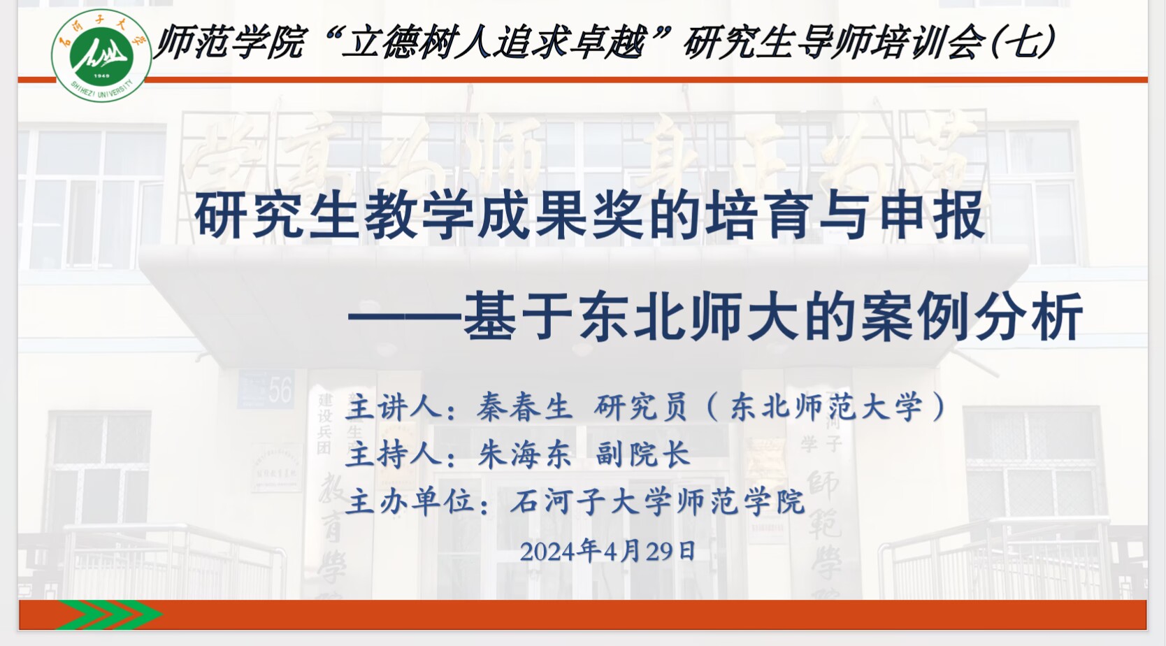 為了進(jìn)一步做好研究生教學(xué)成果的凝練總結(jié),充分展示教書育人成績,提升教學(xué)成果獎申報質(zhì)量,為教師申報校級教學(xué)成果獎奠定基礎(chǔ),促進(jìn)研究生教育質(zhì)量的不斷提高,學(xué)院于4月29日下午在師范學(xué)院四樓會議室開展“立德樹人 追求卓越”第七場研究生導(dǎo)師培訓(xùn)會,培訓(xùn)會邀請東北師范大學(xué)研究生院副院長秦春生研究員圍繞“研究生教學(xué)成果獎的培育與申報——基于東北師大的案例分析”主題開展,講座由學(xué)院分管研究生教育工作的朱海東副院長主持,學(xué)院研究生導(dǎo)師和感興趣的研究生參加了此次培訓(xùn)會。