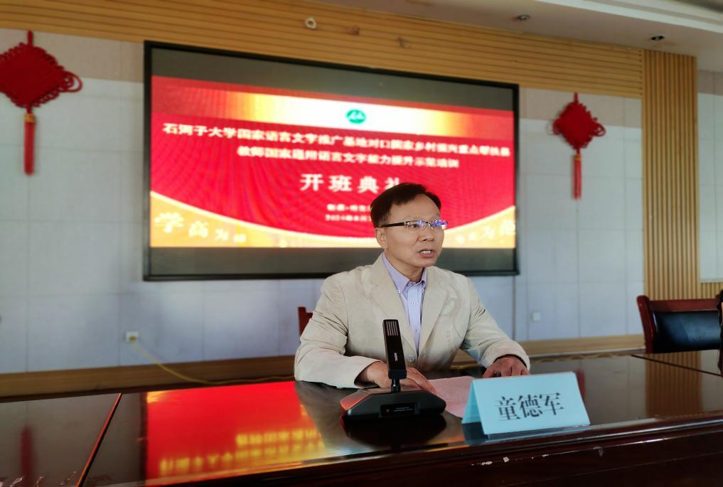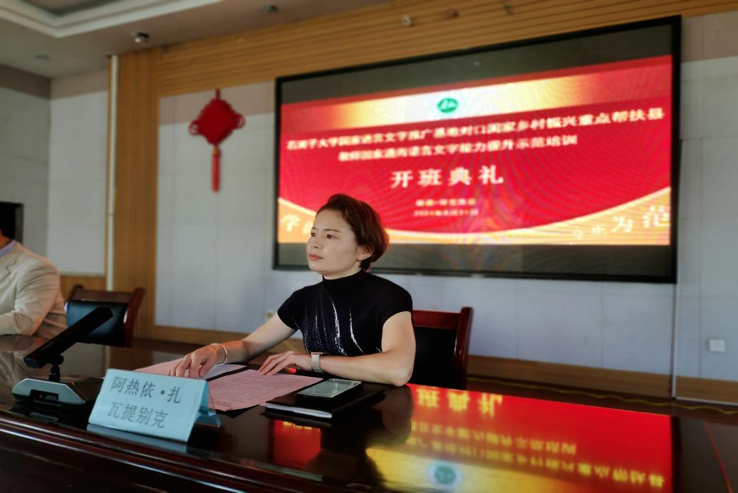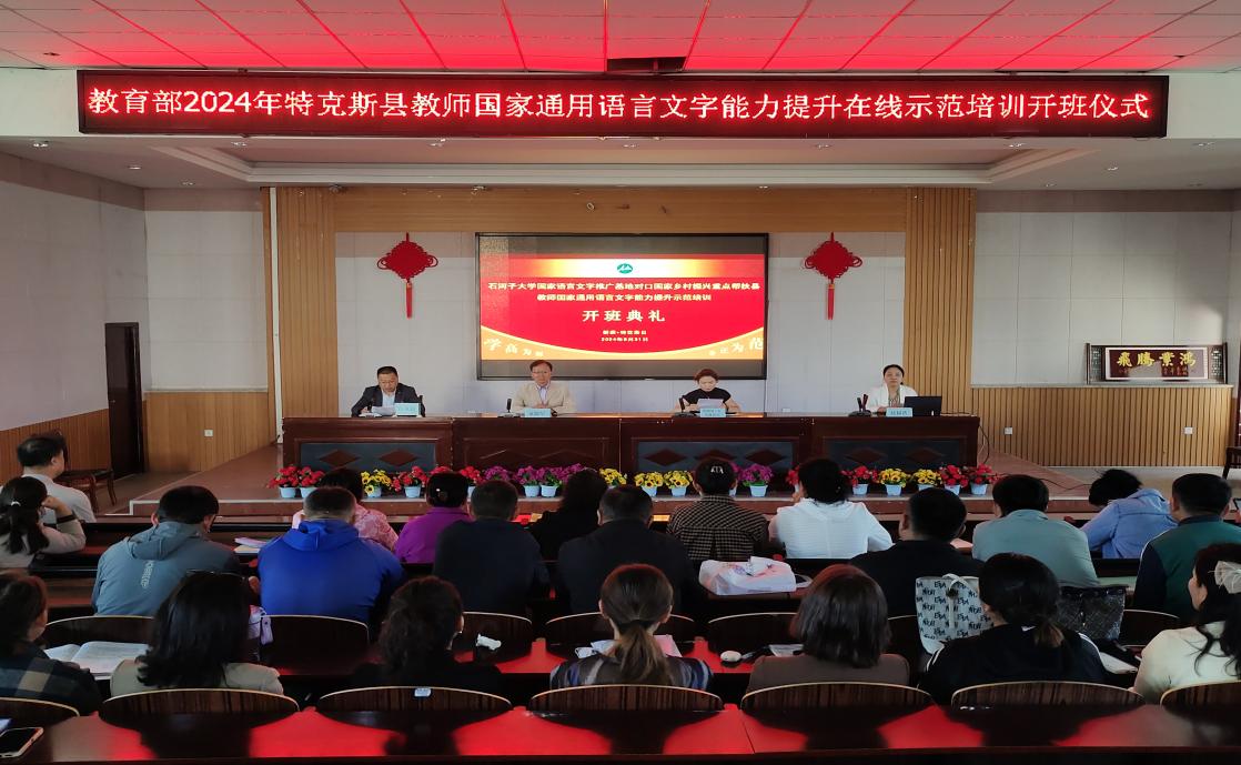8月31日,石河子大學(xué)國(guó)家語(yǔ)言文字推廣基地對(duì)口國(guó)家鄉(xiāng)村振興重點(diǎn)幫扶縣教師國(guó)家通用語(yǔ)言文字能力提升示范培訓(xùn)項(xiàng)目在特克斯縣第二中學(xué)舉行開(kāi)班典禮,兵團(tuán)教育學(xué)院院長(zhǎng)童德軍、特克斯縣教育局局長(zhǎng)阿熱依·扎瓦提別克、特克斯縣教育局語(yǔ)委辦負(fù)責(zé)人、石河子大學(xué)培訓(xùn)團(tuán)隊(duì)及50名參訓(xùn)教師參加。