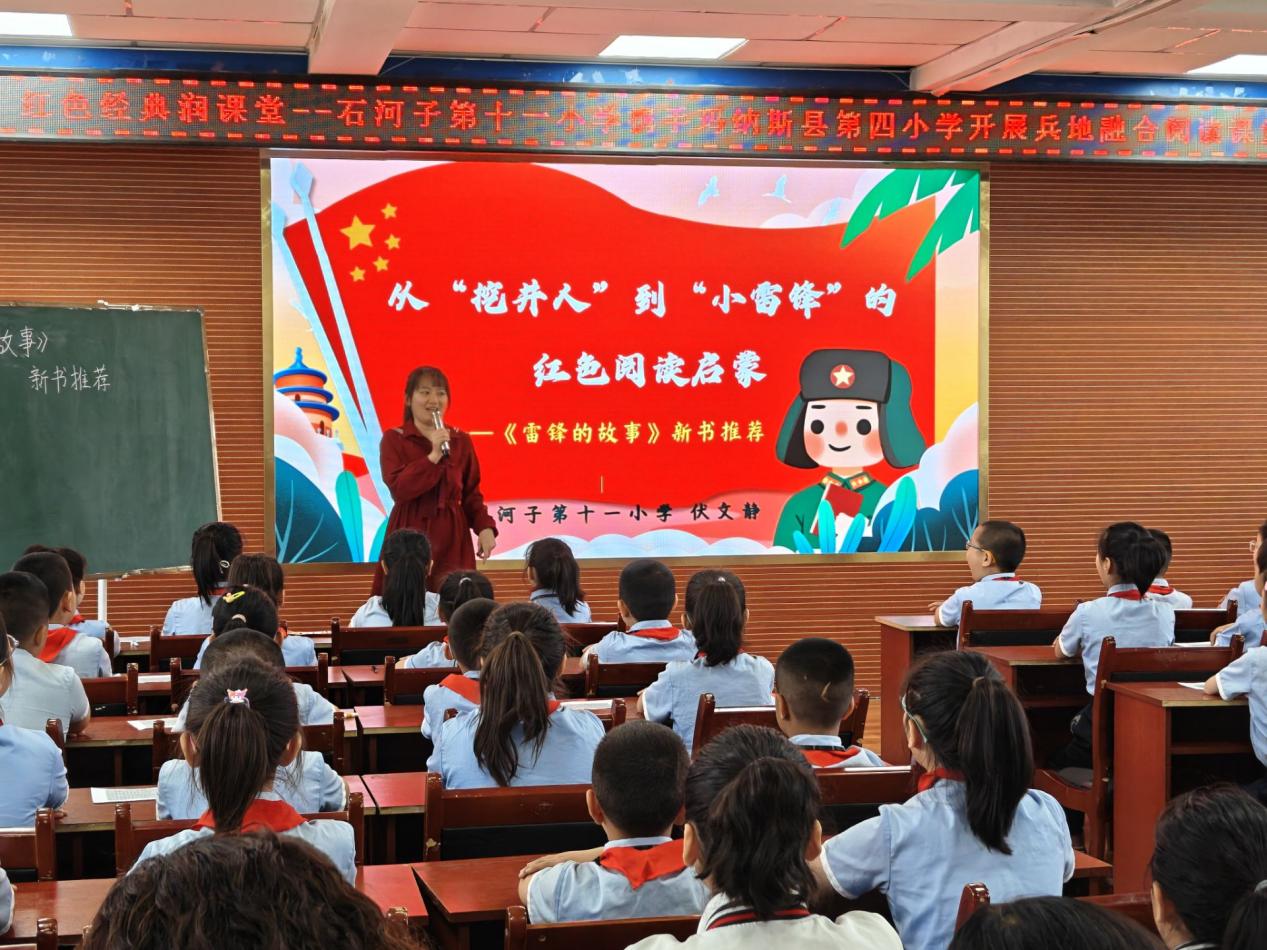 校園內(nèi)洋溢著朗朗書聲,濃郁的文化氛圍和蓬勃的育人氣象迎面而來。在“兵地書香共傳承,紅色經(jīng)典潤課堂”兵地融合閱讀課堂教學(xué)展示活動中,由第十一小學(xué)的伏文靜老師主講的《雷鋒的故事》,巧妙地以“吃水不忘挖井人”為引,深入闡釋了雷鋒精神,引導(dǎo)學(xué)生通過觀察插圖、品味語言、解讀標(biāo)題和聯(lián)系實際四個環(huán)節(jié)深入體驗紅色經(jīng)典的內(nèi)涵;瑪納斯縣第四小學(xué)的史清健老師主講的《閃閃的紅星》,以一顆紅星為主題線索,向?qū)W生們傳授了如何聯(lián)系上下文、做批注、跳讀等閱讀技巧。課堂上,小學(xué)生們積極踴躍地舉手發(fā)言,稚嫩卻堅定的聲音,傳遞出對紅色精神的深刻理解,使在場的師范生們深刻感受到了教育喚醒生命的強(qiáng)大力量。