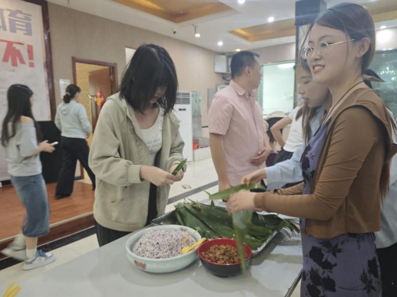 致辭結束后,活動迎來“粽葉連心”創(chuàng)意包粽環(huán)節(jié)。現(xiàn)場各族師生圍坐成圈,互幫互助、默契協(xié)作。粽葉翻飛間,大家靈巧地折粽葉、填糯米、裹餡料、扎繩結,在歡聲笑語中完成一個個精巧的粽子。粽葉清香與師生們的熱情交融,傳統(tǒng)習俗的獨特魅力盡顯無遺。大家在協(xié)作中拉近了距離,增進了情誼,文化認同在互動中不斷深化,恰似緊密相依的石榴籽,團結情誼在包粽過程中愈加深厚。